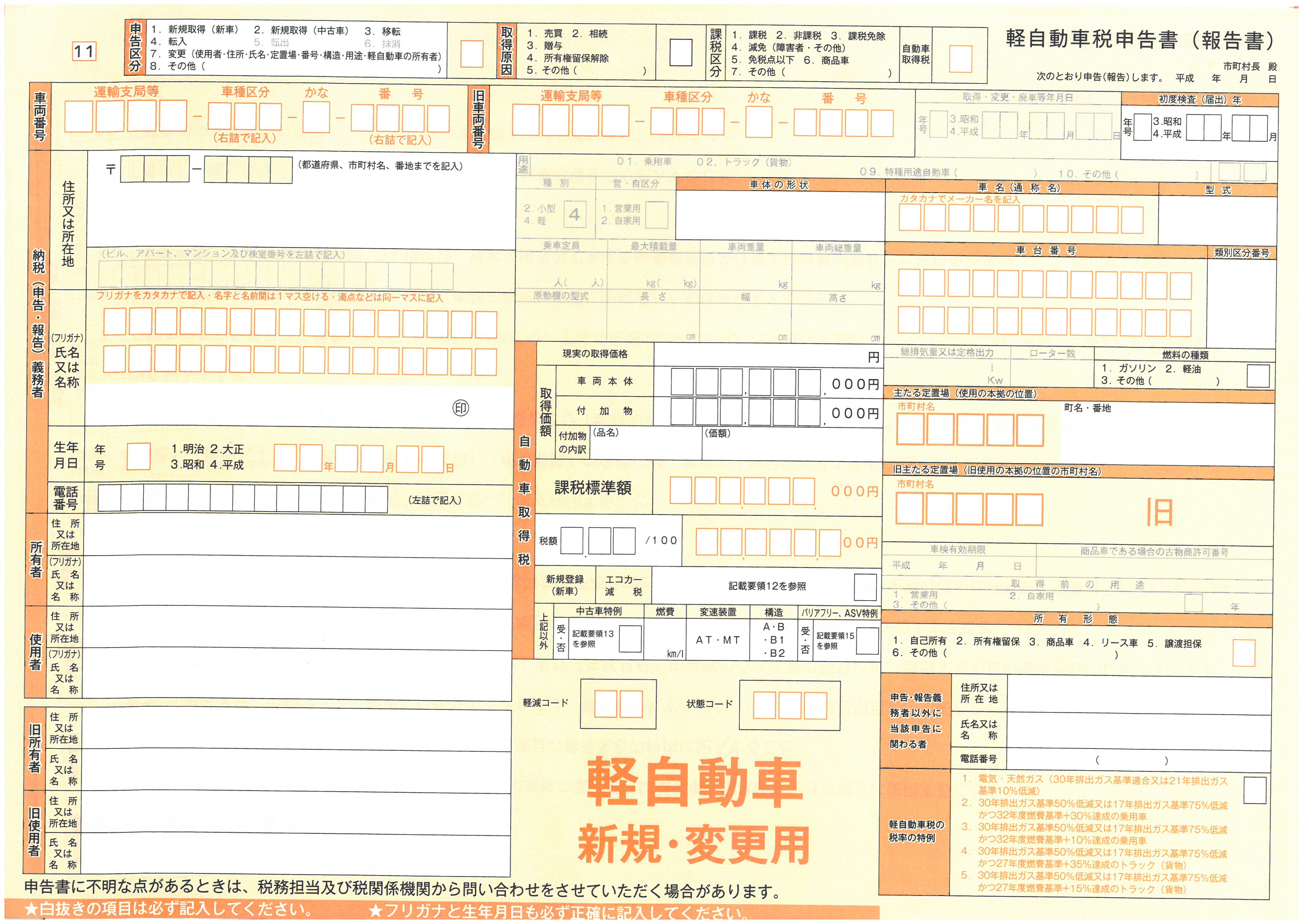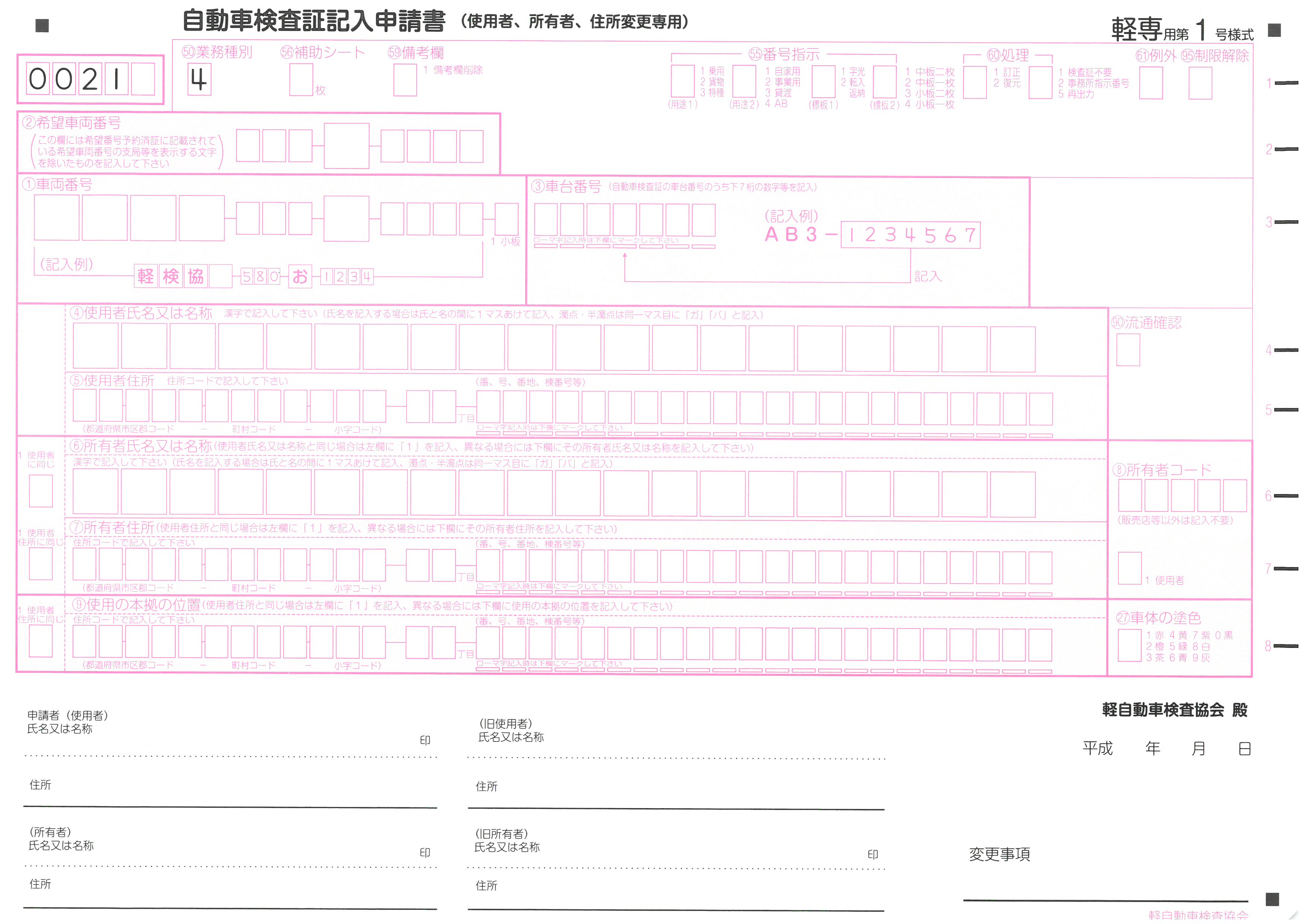 軽自動車検査協会にしか置いていない申請書(コピー不可)です。当方でご用意します。