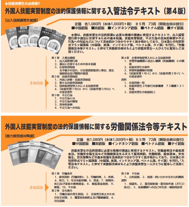 テキストにはJITCOの「入管法令テキスト」と「労働関係法令等テキスト」を使用します。
